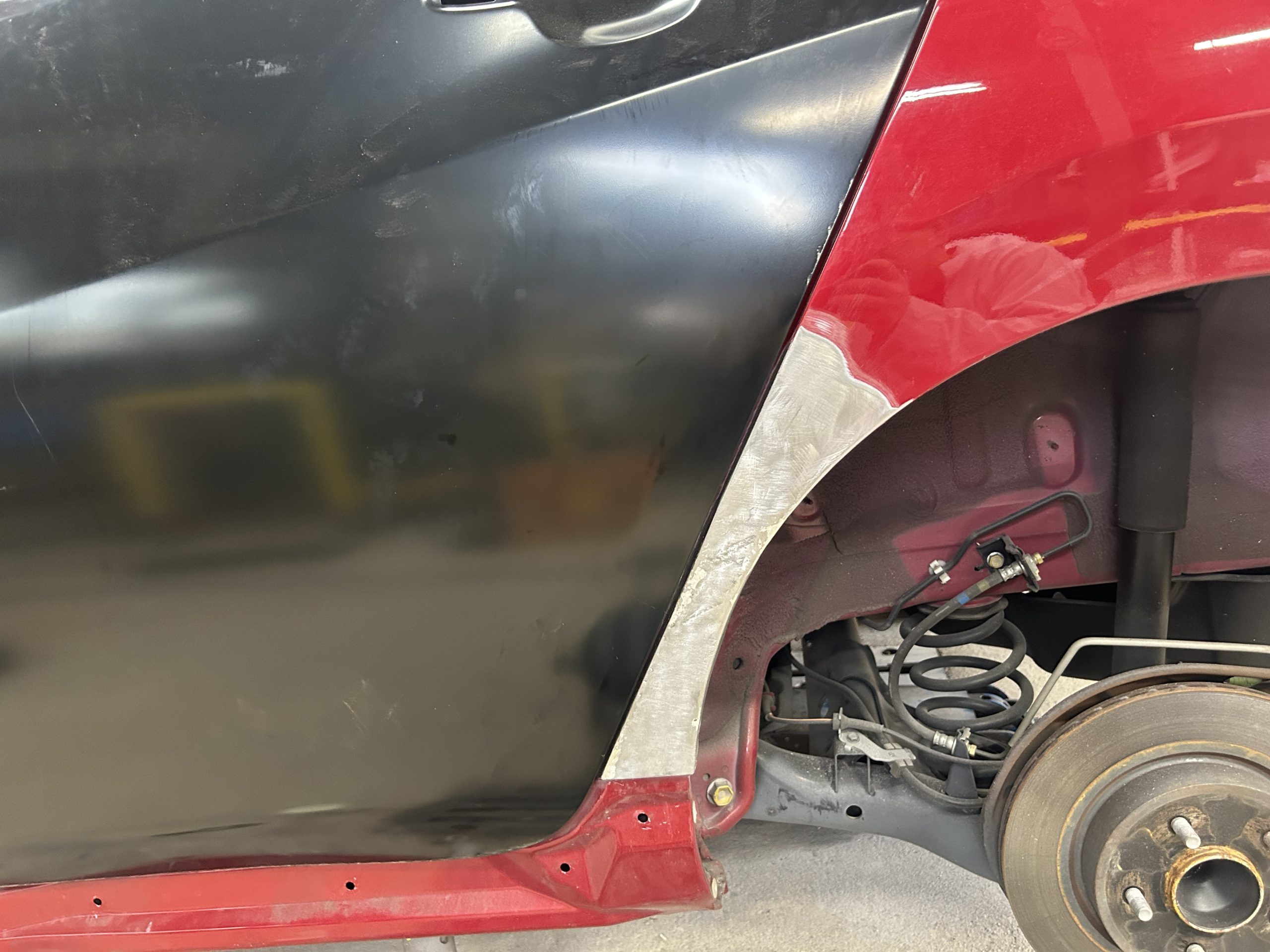 リヤのアーチは大きく損傷していますが交換せずに鈑金で修理します。