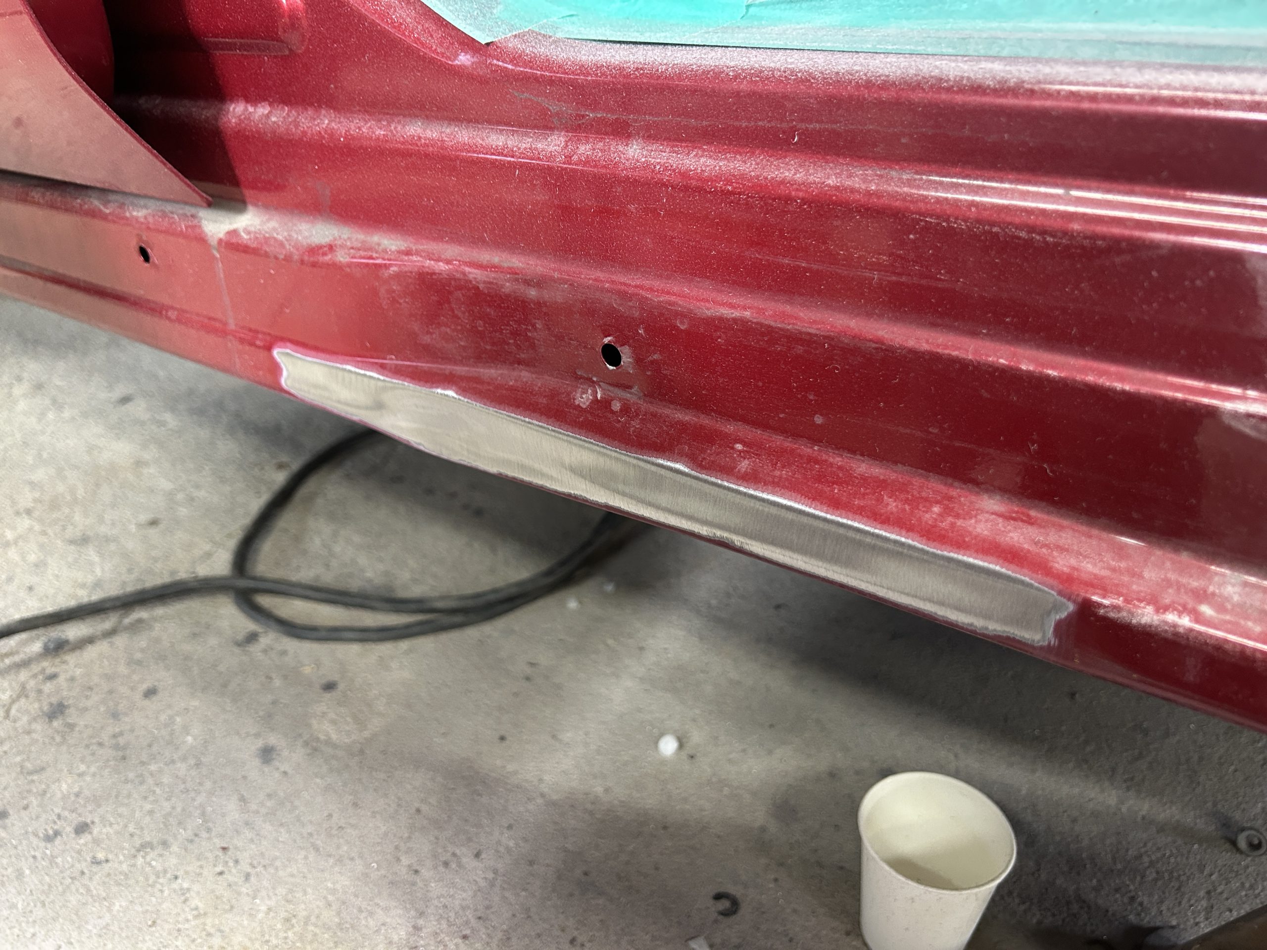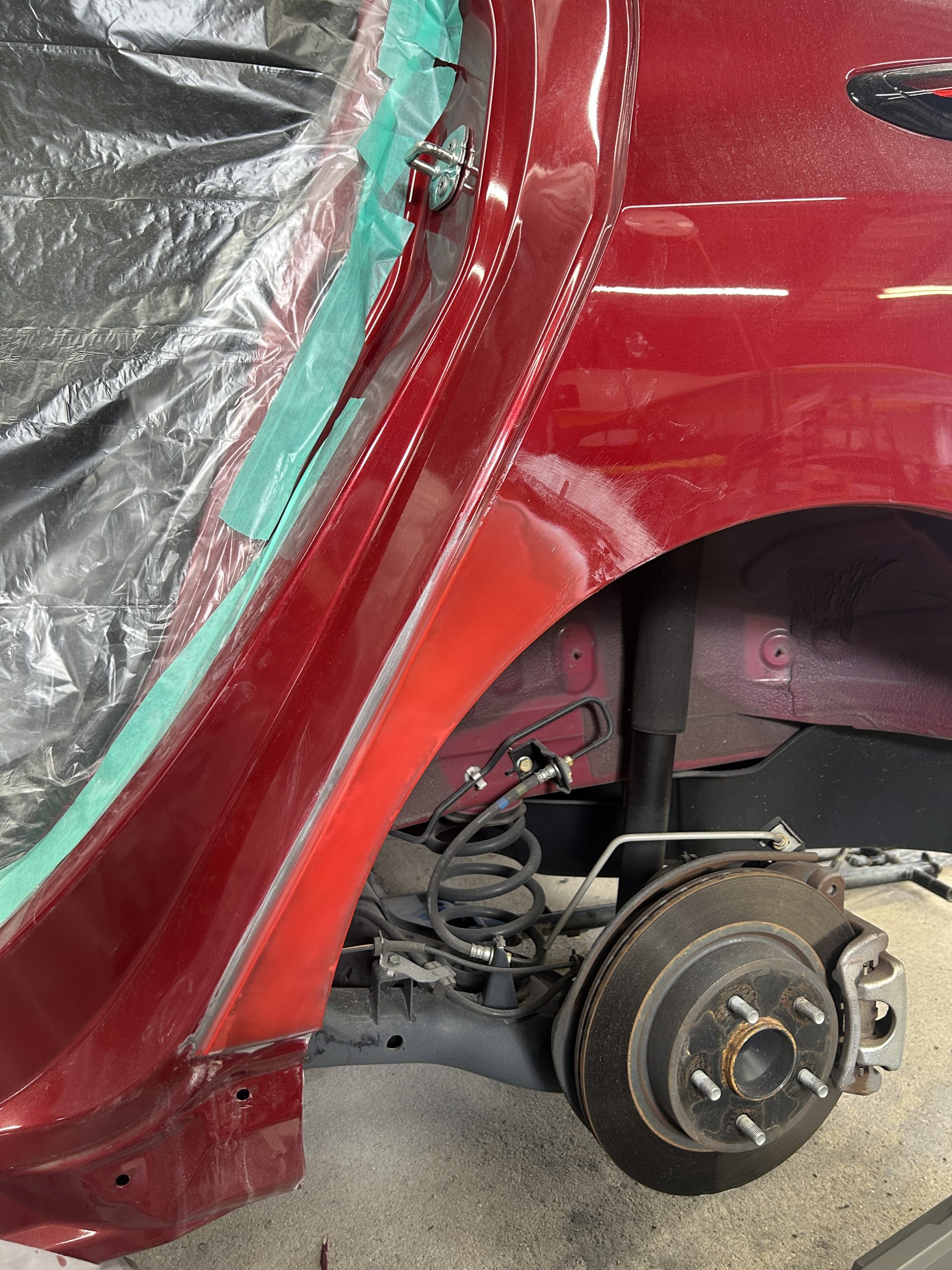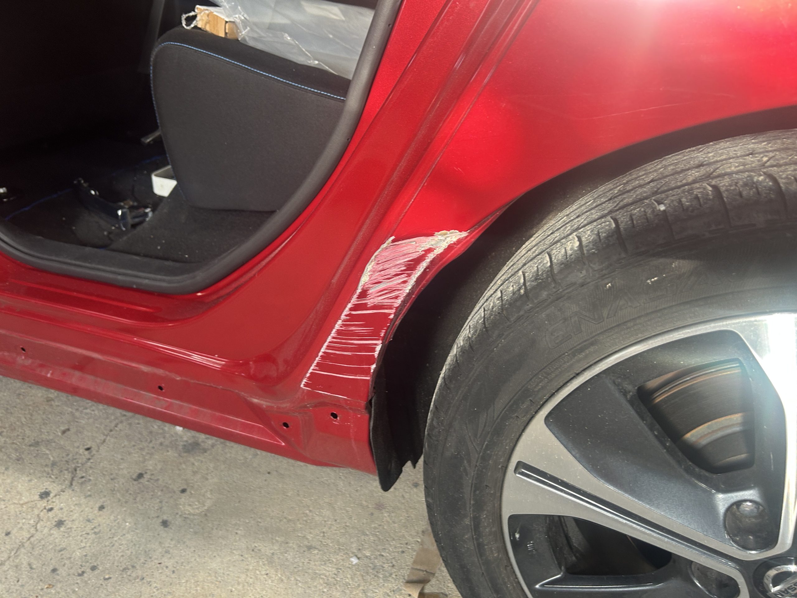 リヤのアーチは大きく損傷していますが交換せずに鈑金で修理します。